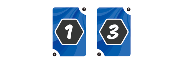Cada color contiene: 2 cartas con el número «1», 2 cartas con el número «2», 2 cartas con el número «3», 1 carta con el número «4», 1 carta con el número «5», 1 carta con el número «6»