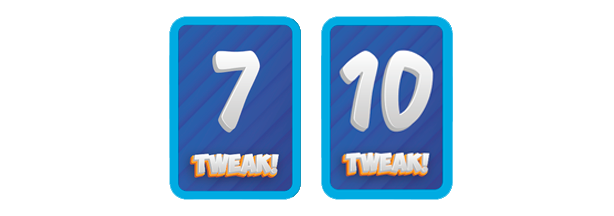Cambia esta carta con un 7 por una cara y un 10 por la que viene en el juego base de TWEAK! si quieres tener la posibilidad de que, una vez terminado el mazo, puedas cambiar el objetivo entre 7 y 10. Se coloca al final del Mazo Central antes de comenzar la partida del lado que desee el repartidor de esa mano. Su función es recordar que, una vez agotado el mazo, la Suma Objetivo será siempre 7 o 10 hasta el final de la partida. Esta carta permanece sobre la mesa en todo momento y no puede robarse, jugarse ni voltearse, salvo mediante el uso de las cartas [T!] de cambio de objetivo.
